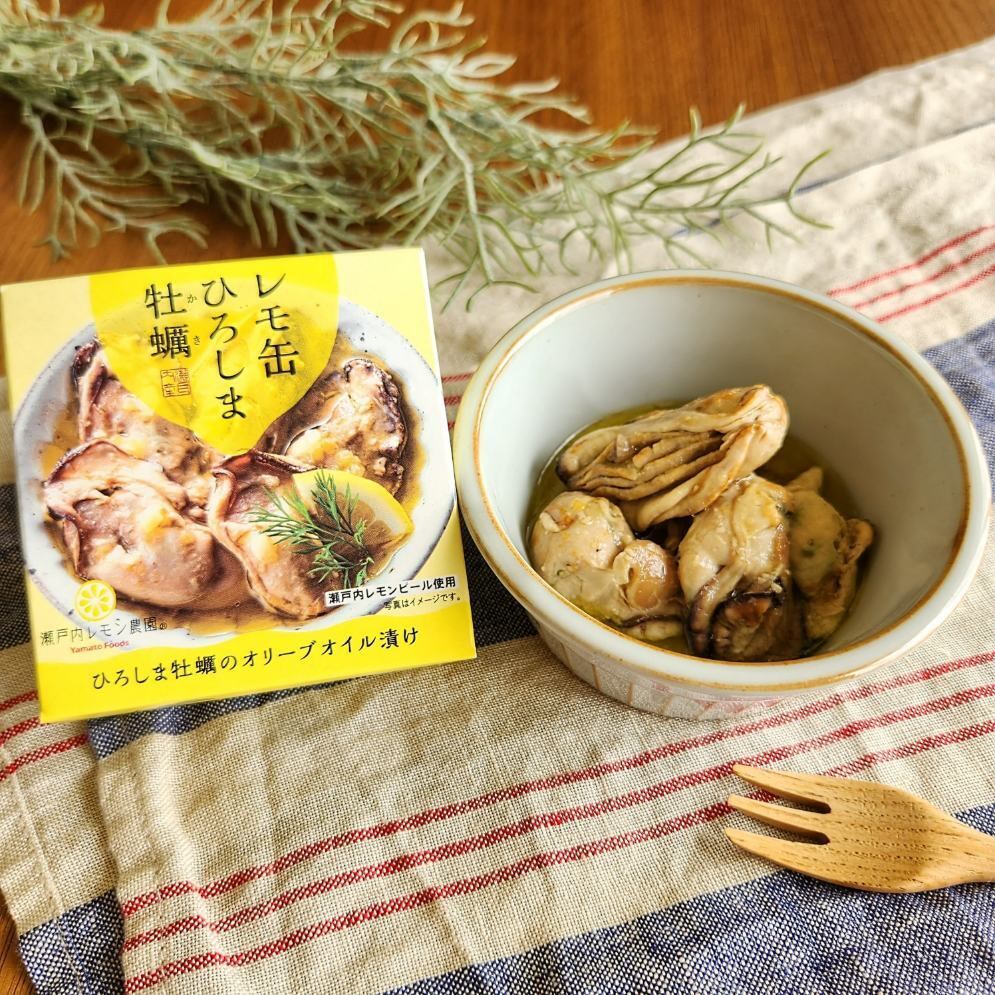 原材料名・かき(広島県産)、オリーブオイル、塩レモン(レモンピール、レモン果汁、食塩)、レモン果汁、菜種油、食塩、