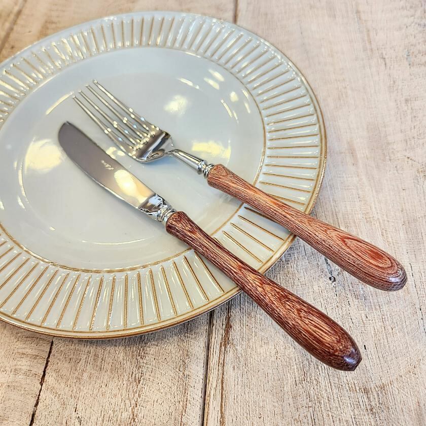 桜の薄皮を何枚も重ね合わせた合板を削り出してハンドルにしているカトラリー。